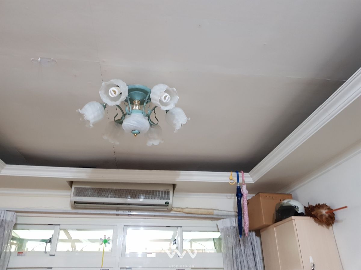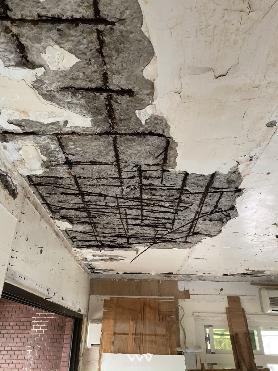 觀察原始天花樓板是否有水泥板塊剝落,這可能是鋼筋鏽蝕、吸水膨脹造成的爆裂。若天花板已有木作包覆,也可觀察是否出現下垂變形,作為初步判斷依據。