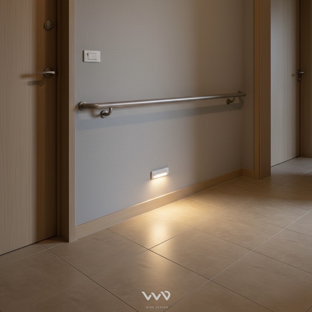 • 感應式照明:走道、床邊、衛浴安裝感應燈,避免夜晚摸黑移動。