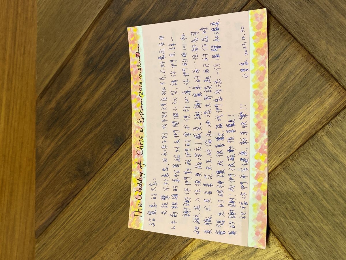 屋主在入住後的日子裡,特地取出當年婚禮的小卡,親筆寫下一封感謝信給寬象設計。 卡片上以他們婚禮的插畫主題為底,文字中滿溢著對新家的喜愛與感動—— 「從入住以來,生活的每一天都能感受到設計團隊的細膩與體貼。」