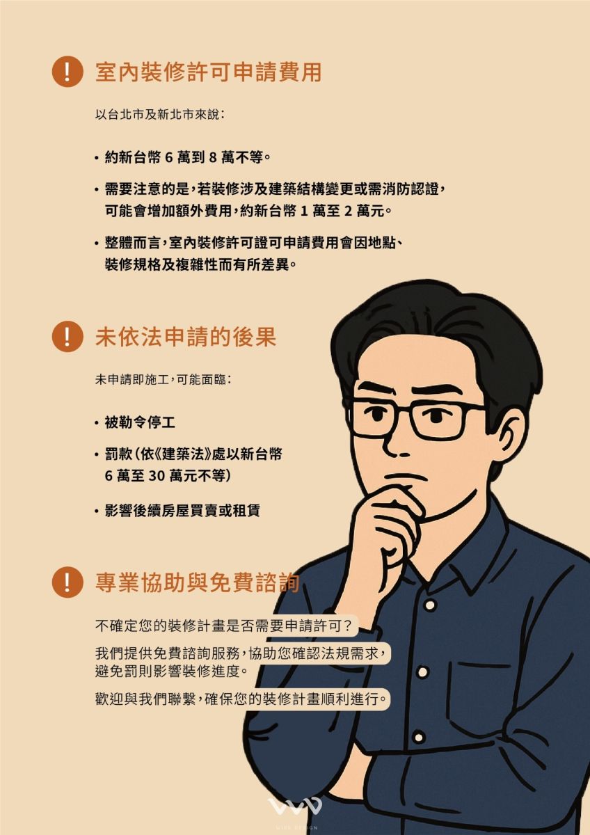 2. 需要注意的是,若裝修涉及建築結構變更或需消防認證,可能會增加額外費用,約新台幣 1 萬至 2 萬元。