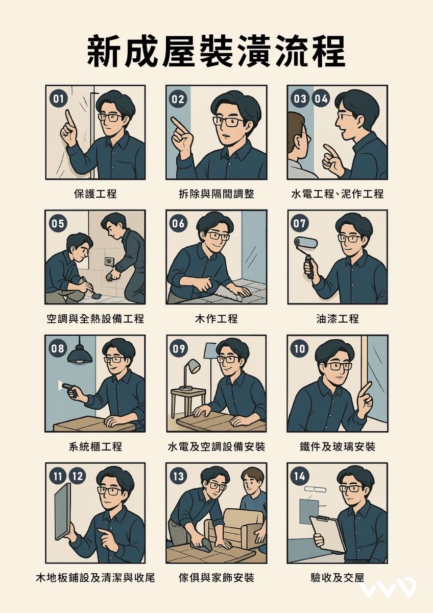 新成屋交屋後,如何將毛胚空間轉變為理想的家,是每位屋主心中的期待。裝潢不僅是美感的呈現,更是實用性與舒適性的結合。對於未經客變的新成屋,如何有條理地進行設計與施工,將直接影響未來的居住體驗。以下為完整的新成屋裝潢順序與流程,許多人有疑問的水電、泥作、木作、油漆等工程的進場時間都包含在其中,讓您可以一步步打造出專屬的理想居所。