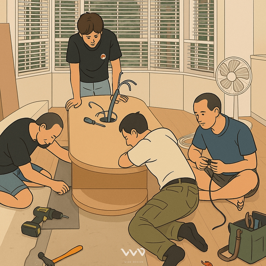 水電工班依據生活需求,確認插座、燈具、水路等位置是否符合日常使用,並於此階段進行適當的調整。