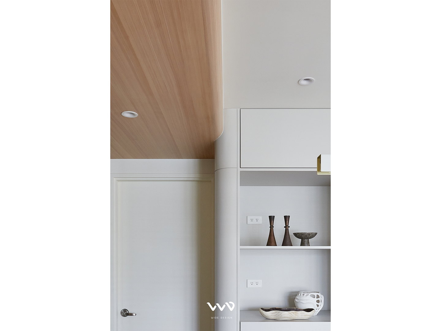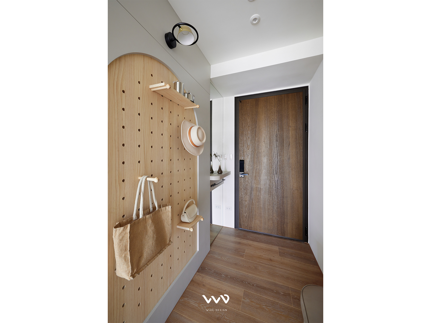 玄關我們以弧角平台及洞洞板牆面收納小物,