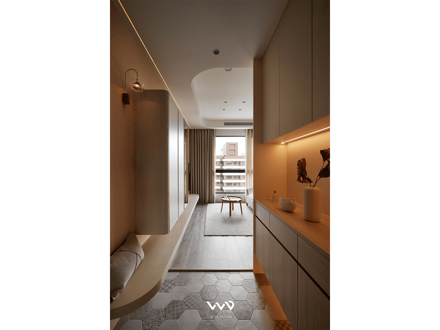 而從電視牆延伸至玄關的層板,