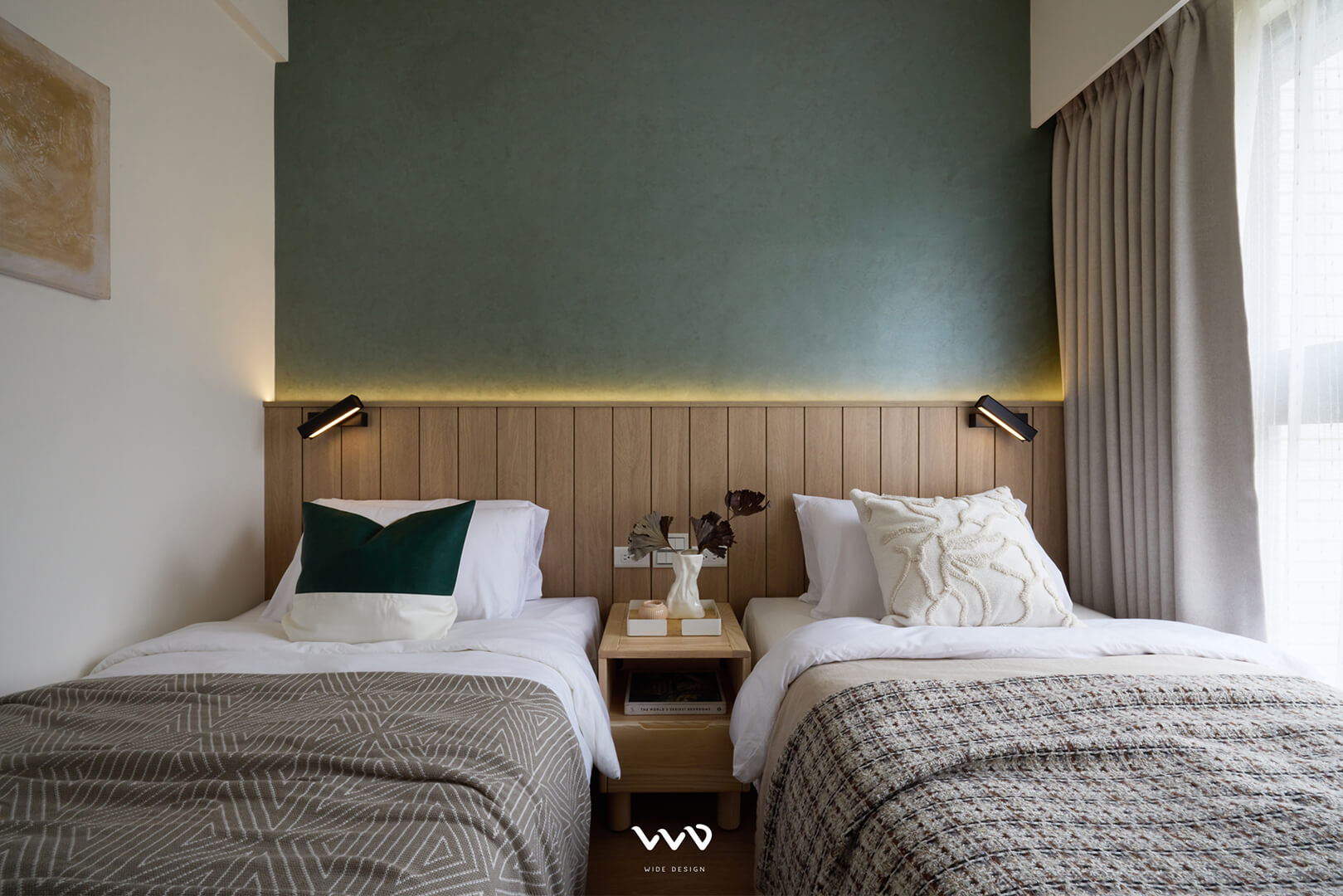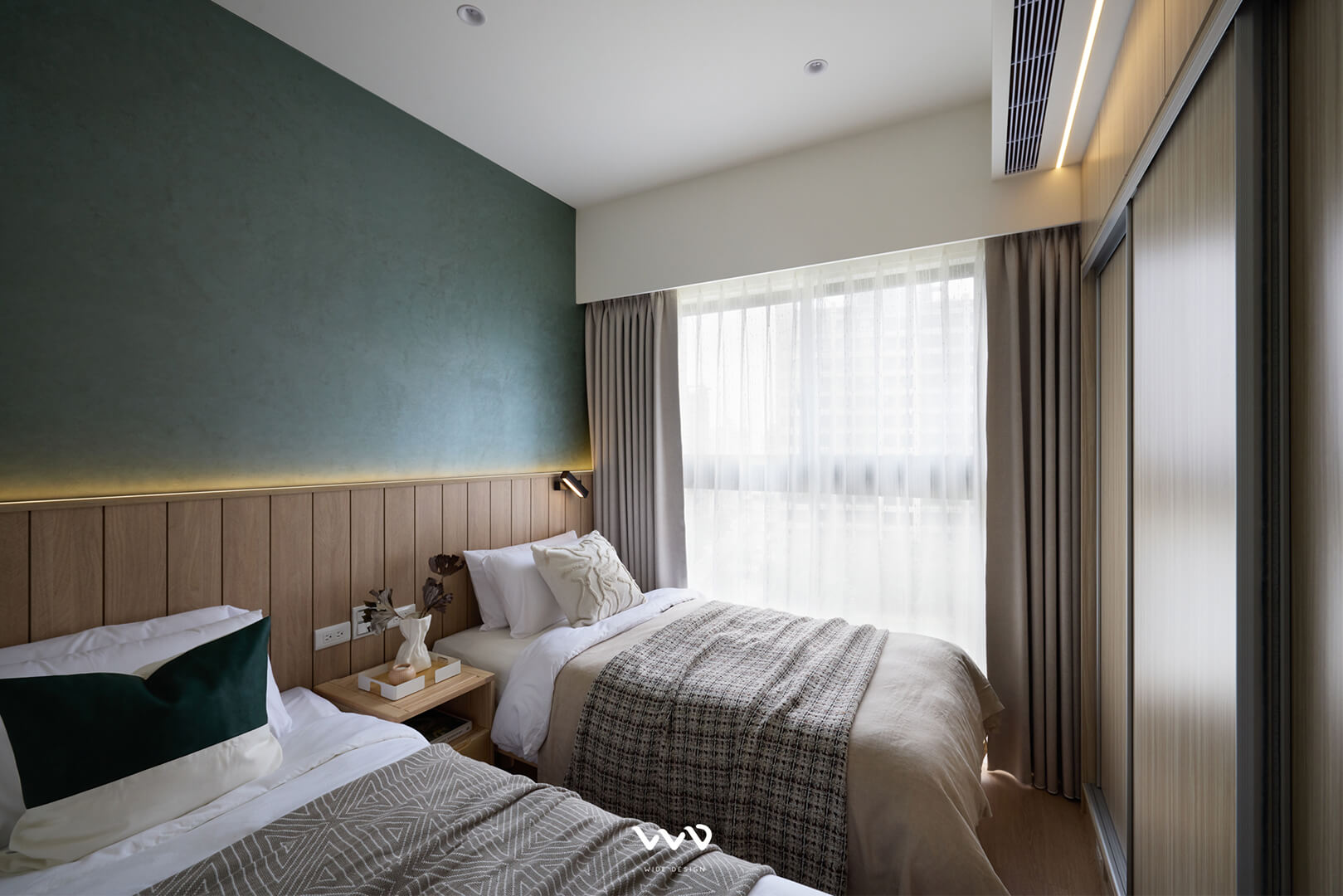 床頭以綠色礦物質感漆搭配間照,創造沈靜的夜晚氛圍。化妝桌則採可旋轉的化妝鏡,讓屋主在夜間起身時不被鏡面反射打擾;貼心的壁燈滿足不同使用習慣,也讓臥室充滿柔和層次。
