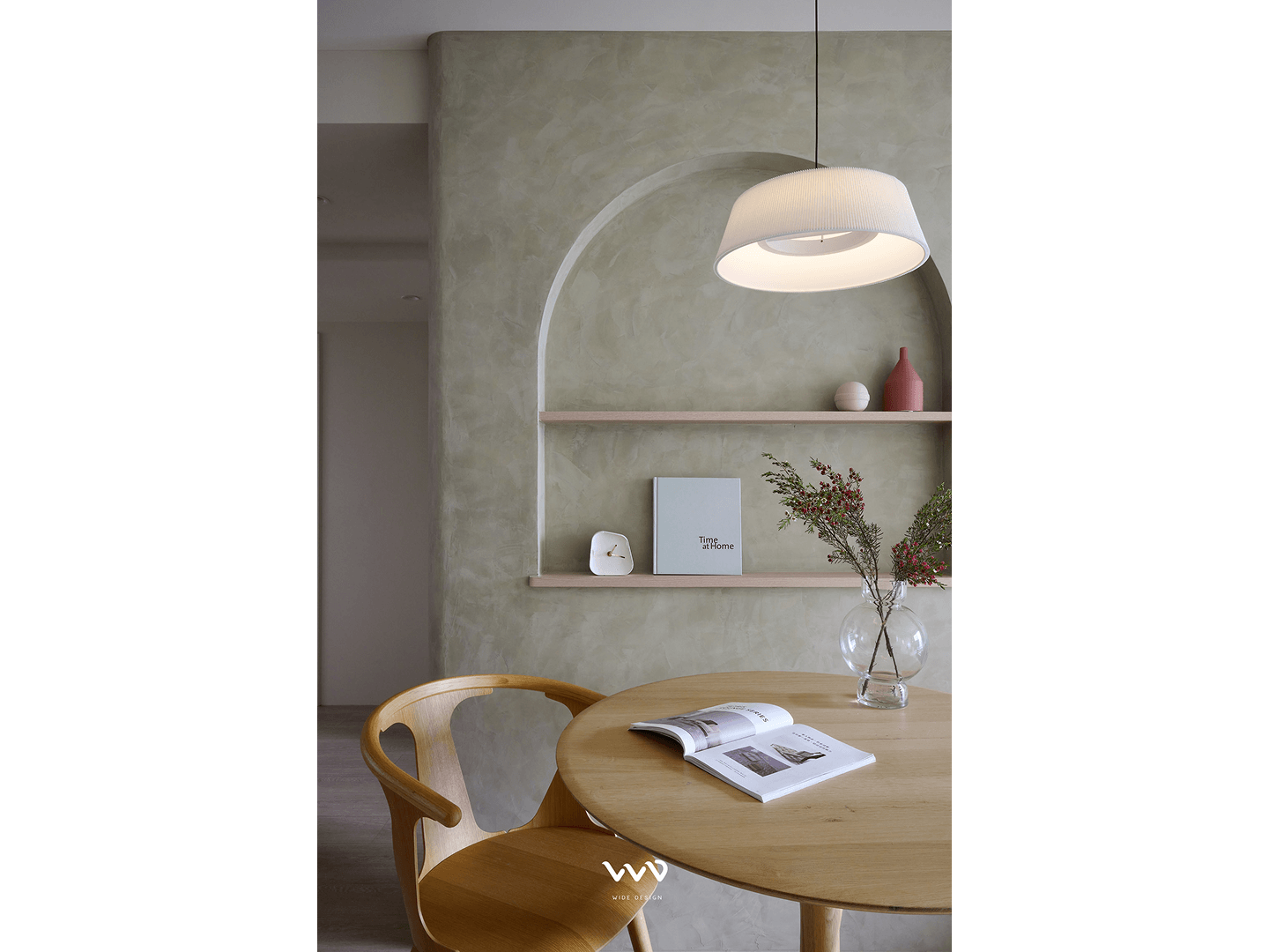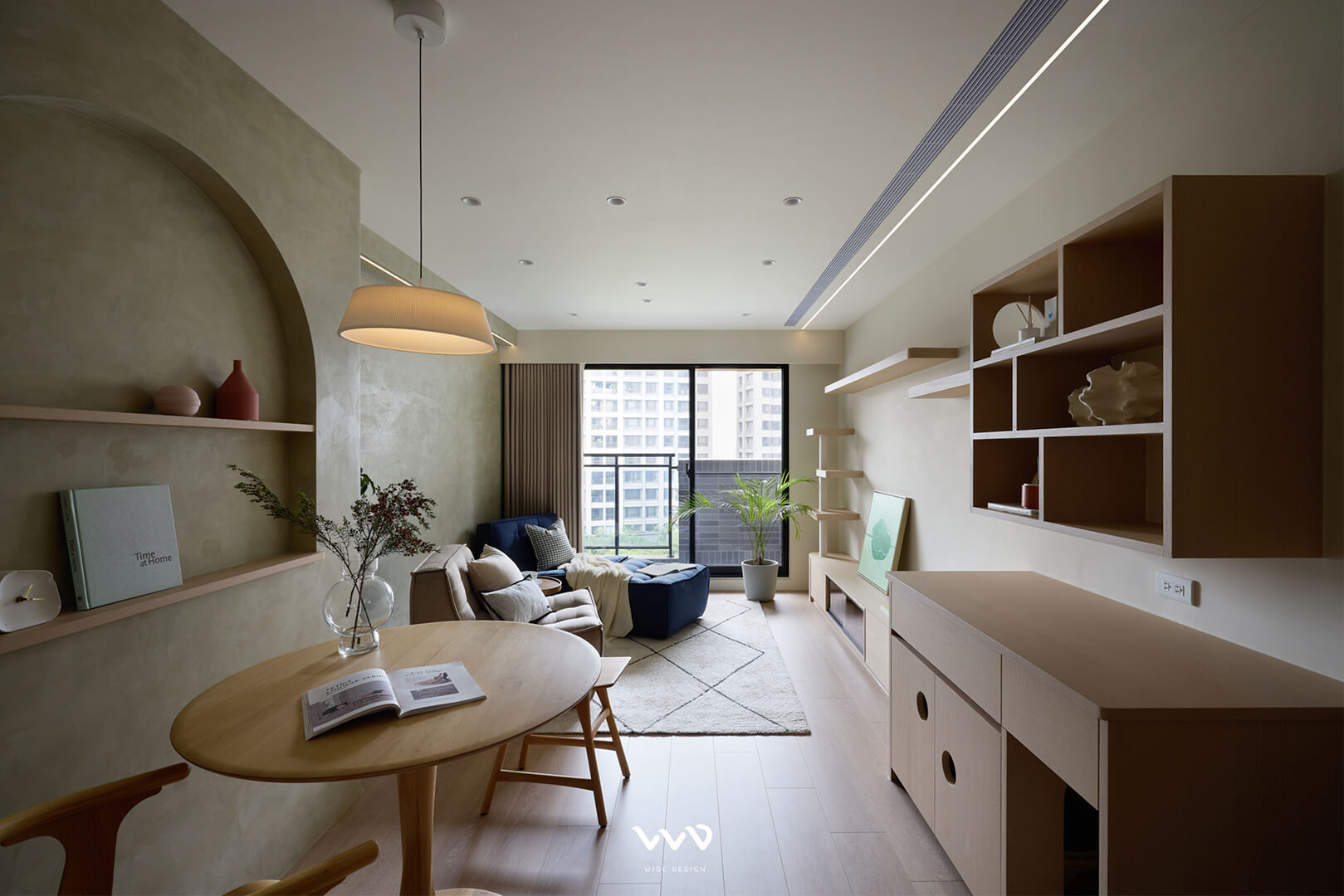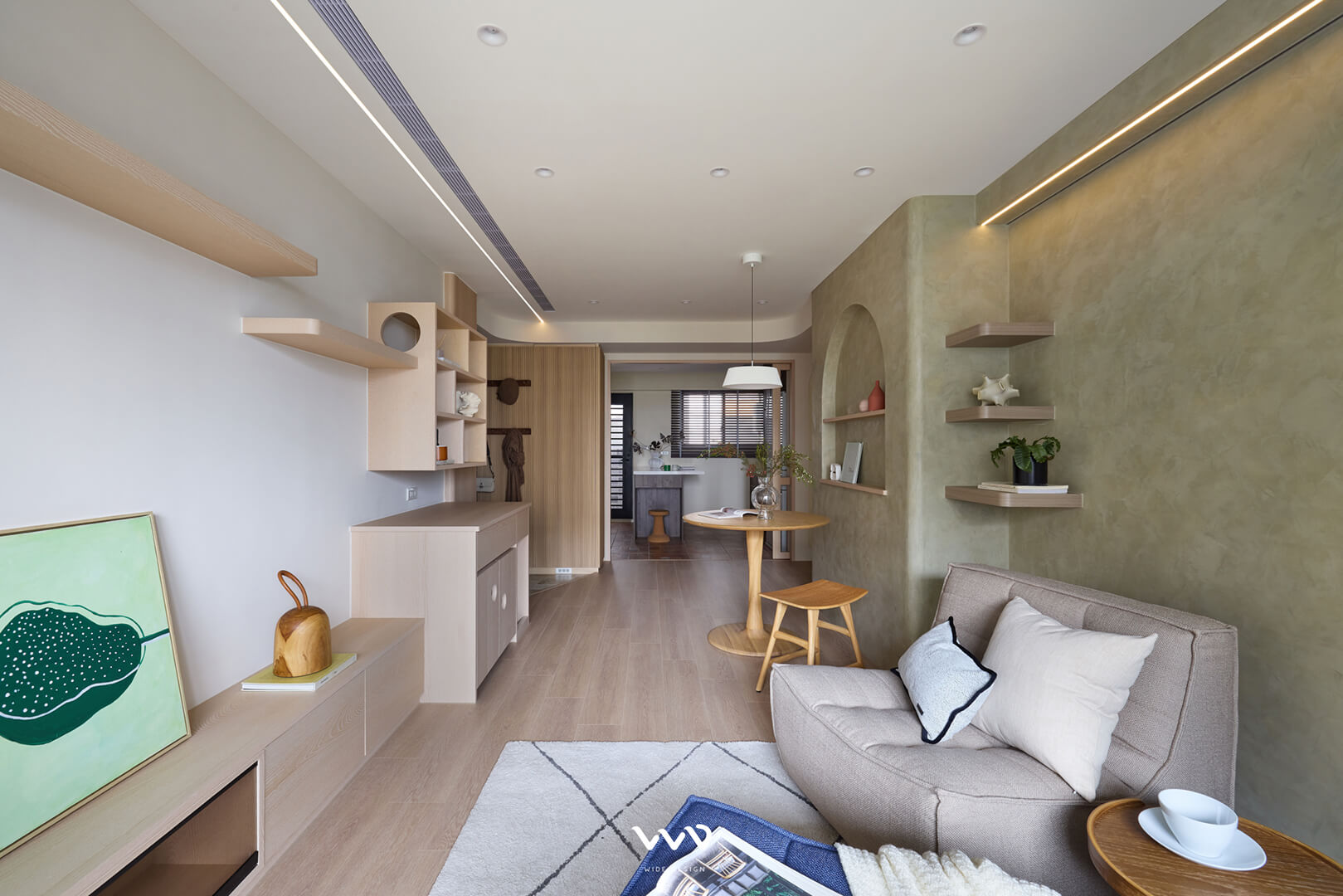 客廳是這個家的靈魂,也是貓咪的舞台。我們將貓砂、飲水與休息區整合於電視櫃旁,再於電視上方設置貓步道,讓屋主在看電視時,也能抬頭看見貓咪慵懶的小身影。沙發背牆與餐桌牆面以同色特殊塗料處理,柔化視覺,連結整個公共空間的溫度。