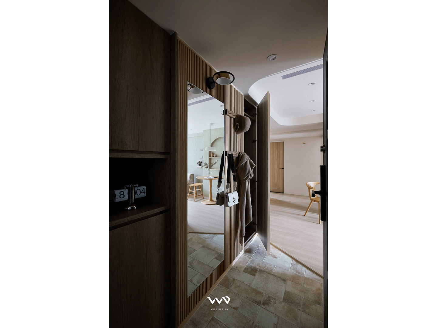 屋主希望有更好的收納量,因此我們大幅調整主臥入口,創造了一間儲藏室。雖然新增的空間不到一坪,卻讓三個區域同時受益:主臥多了化妝桌的餘裕、床尾衣櫃的比例更完整,而客廳與餐桌因動線延伸而形成流暢感,整體氛圍更溫暖。儲藏室本身也透過壁掛系統與插座配置,成為全家最便利的清潔備品中心。